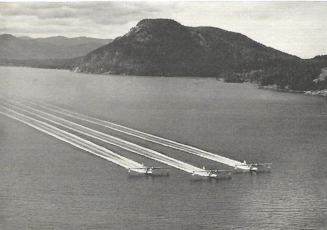 Wartime Canso PBYs (right) in Patricia Bay, near Victoria, B.C. Squadron Leader Bruce Olson, shown above, was flying the Canso in the center of the formation.