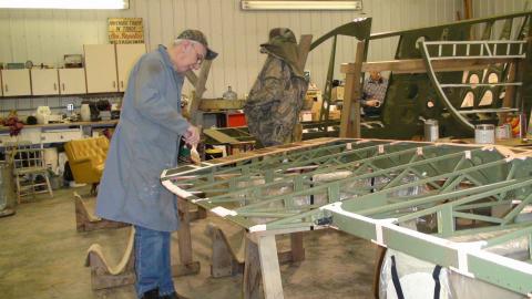 Video Right: Robert Lawrence and Henry Dechant of the Fabric Crew talk about the final steps taken in the re-covering with fabric, applying poly-brush and coats of silver, white and orange paint on the elevators and rudder of Canso FNJE