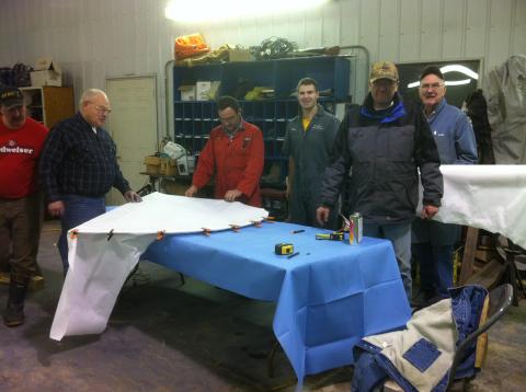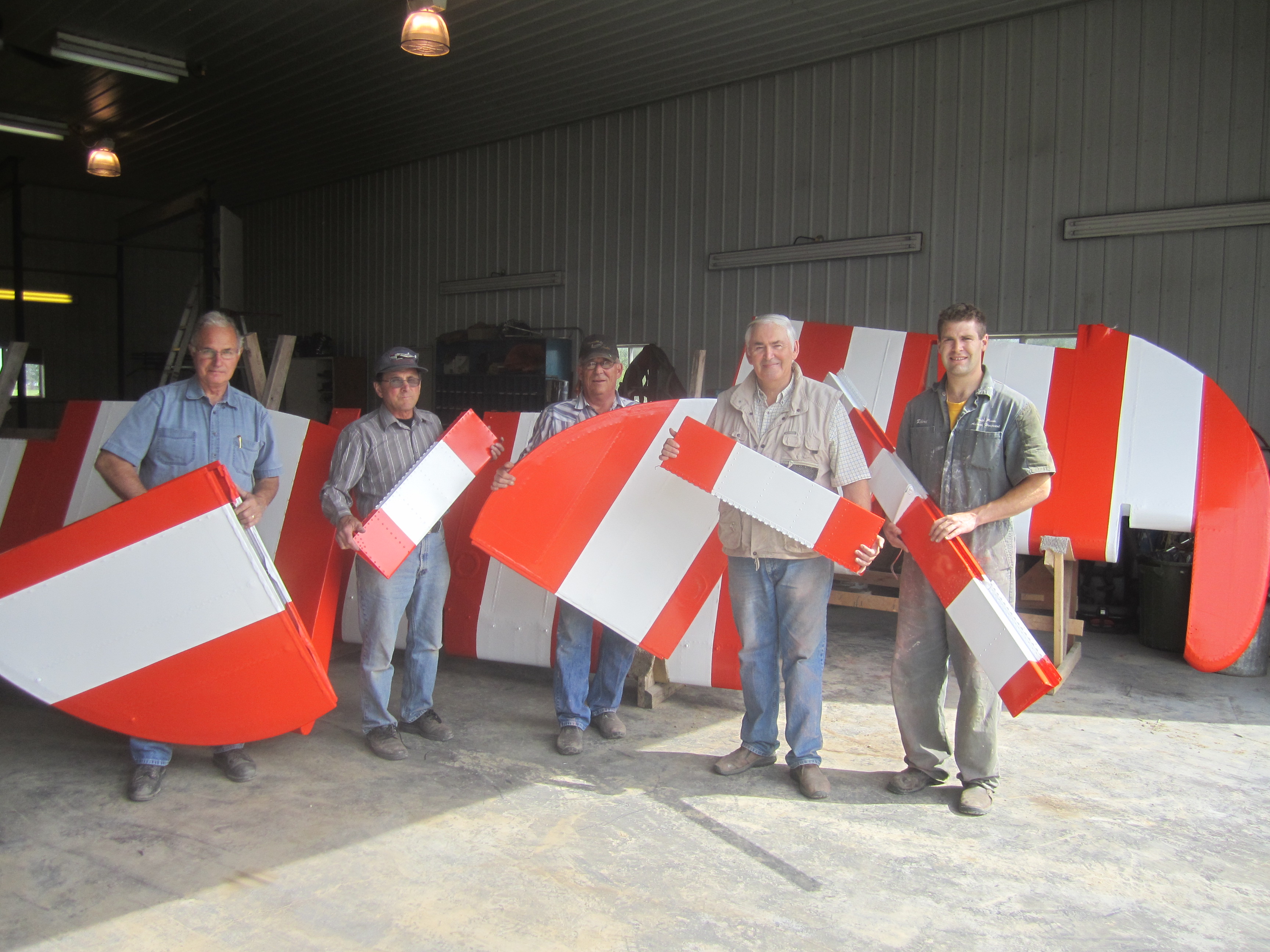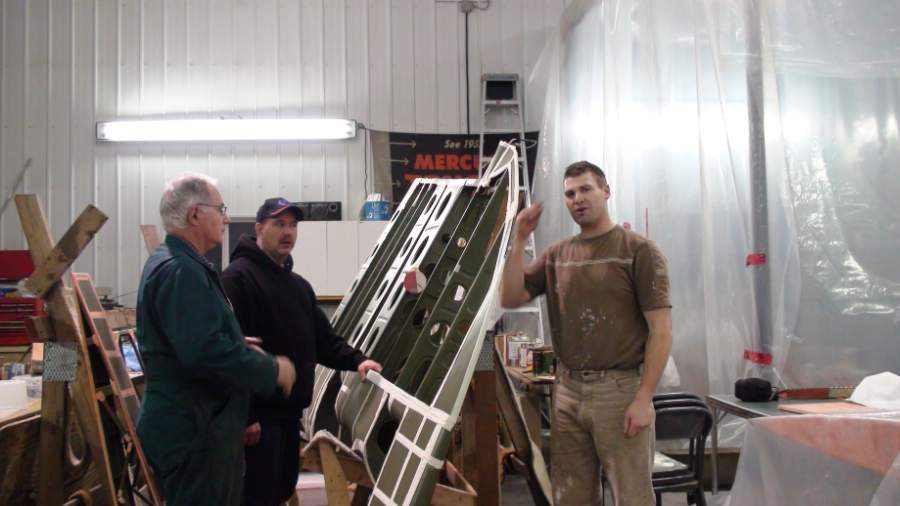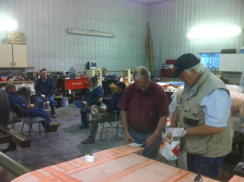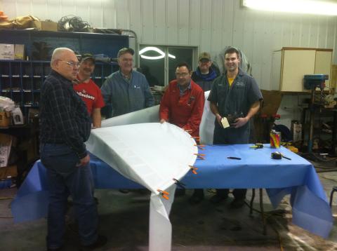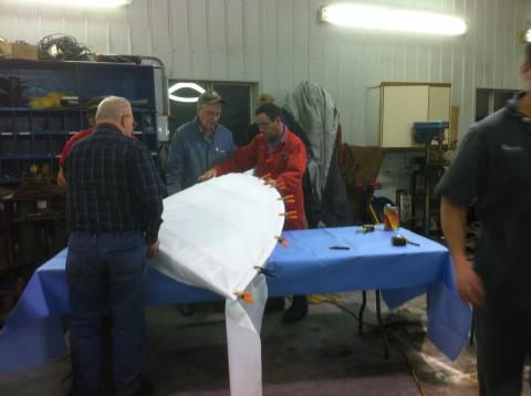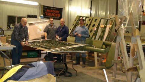 Above: Part of the Fabric Crew for FNJE finally finished fabric work on the control surfaces - from left: Henry Dechant, Don Wieben, John Campbell, Doug Roy and Robert Lawrence (chief painter)
