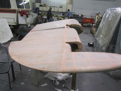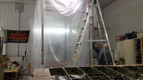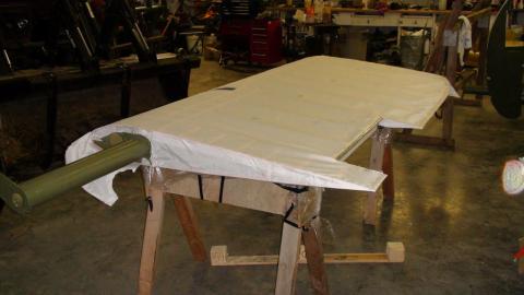 Replacing the fabic on the control surfaces is going very well - YouTube videos below show Robert Lawrence, Don Wieben, Henry Dechant and Brian Wilson moving an elevator into the spray booth. The second video shows Robert putting the final layer of polyspray on the rudder of FNJE