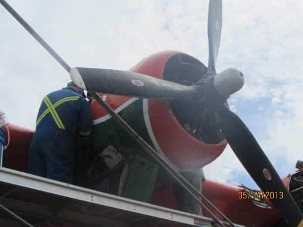 Photo above: February, 2014 - Joe Gans, with Fairview Aircraft Restoration Society (FARS) working at Greg Wieben's shop, doing a borescope inspection on the port engine. This was one of the serviceable engines brought back from St. Anthony, Newfoundland as part of the Great Canadian Aircraft Engine Exchange