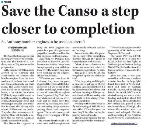 We were very pleased to hear from another strong supporter of the SavetheCanso project - Tom O'Brien, Mayor of the Town of Stephenville, NL, who signed our guest book and sent best wishes for 2015. Tom's support was very instrumental in the Canso Crew being able to make what came to be known as the "Great Canadian Aircraft Engine Exchange", in May of 2013. The Towns of Stephenville and St. Anthony, Newfoundland, had been given a sister plane to our FNJE by the Provincial Government to be used as a commemorative display aircraft recognizing the important role the Canso PBY-5A played fighting forest fires and transporting medical patients in earlier years. The aircraft was first given to Stephenville, NL and then they agreed to move it to St. Anthony so therefore both towns had to agree with the proposal to exchange the good serviceable engines that were on their Canso (IZU) for the two timed out engines, that FARS would supply. Thankfully, in a great spirit of Canadian neighbourliness, an agreement was reached and the Canso Crew travelled some 13,000 kms across Canadian to exchange the engines. This gesture was a great morale and financial boost to the restoration project and it was agreed that FARS will attempt, as part of an epic Canadian tour, to fly the Canso to Newfoundland to visit these two great maritime towns, some time in the future.